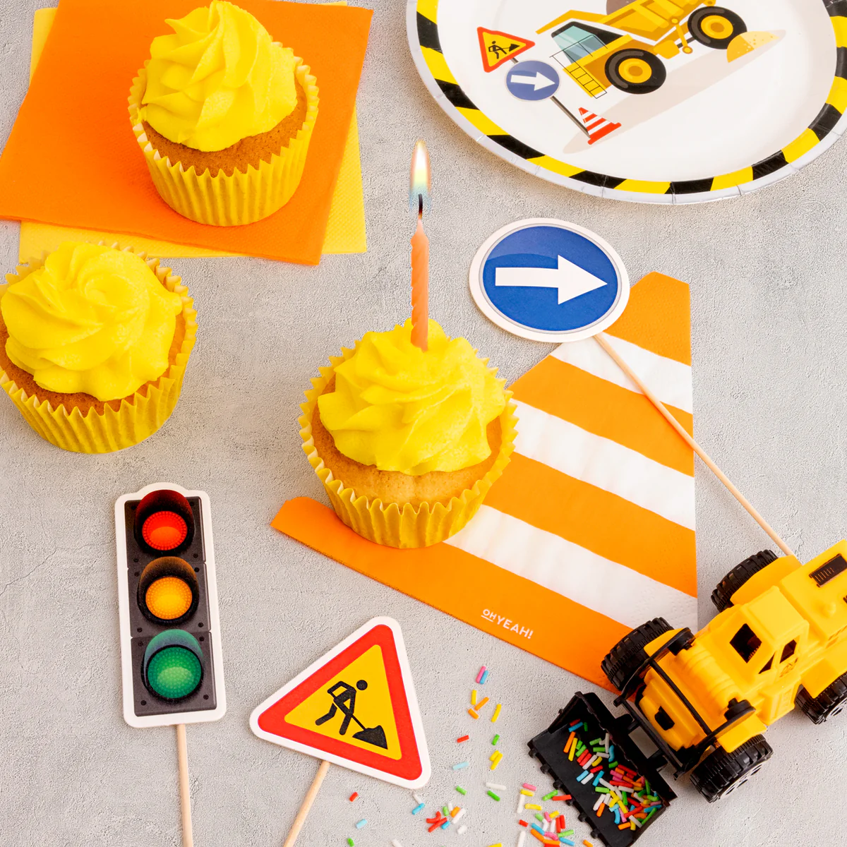 Fabricada con materiales resistentes y fáciles de montar, se puede colocar en paredes, mesas, entradas o centros de mesa, aportando un toque decorativo que combina con otros artículos de la colección de construcción como globos, platos, vasos y toppers.
