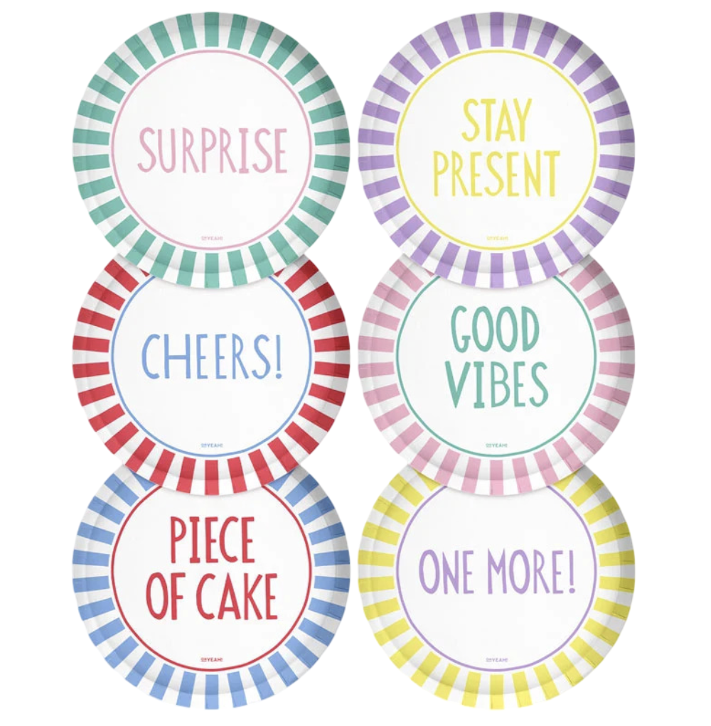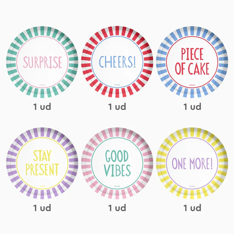 Estos originales platos Happy Vibes de colores se inspiran en la tendencia a rayas italianas y están pensados para hacer de tu fiesta de cumpleaños un recuerdo único. Cada plato representa un momento especial de la celebración: