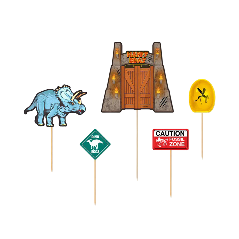 Incluye diferentes diseños divertidos como dinosaurios, señales jurásicas y puertas temáticas, ideales para crear una decoración llamativa y original en tartas, cupcakes o mesas dulces.